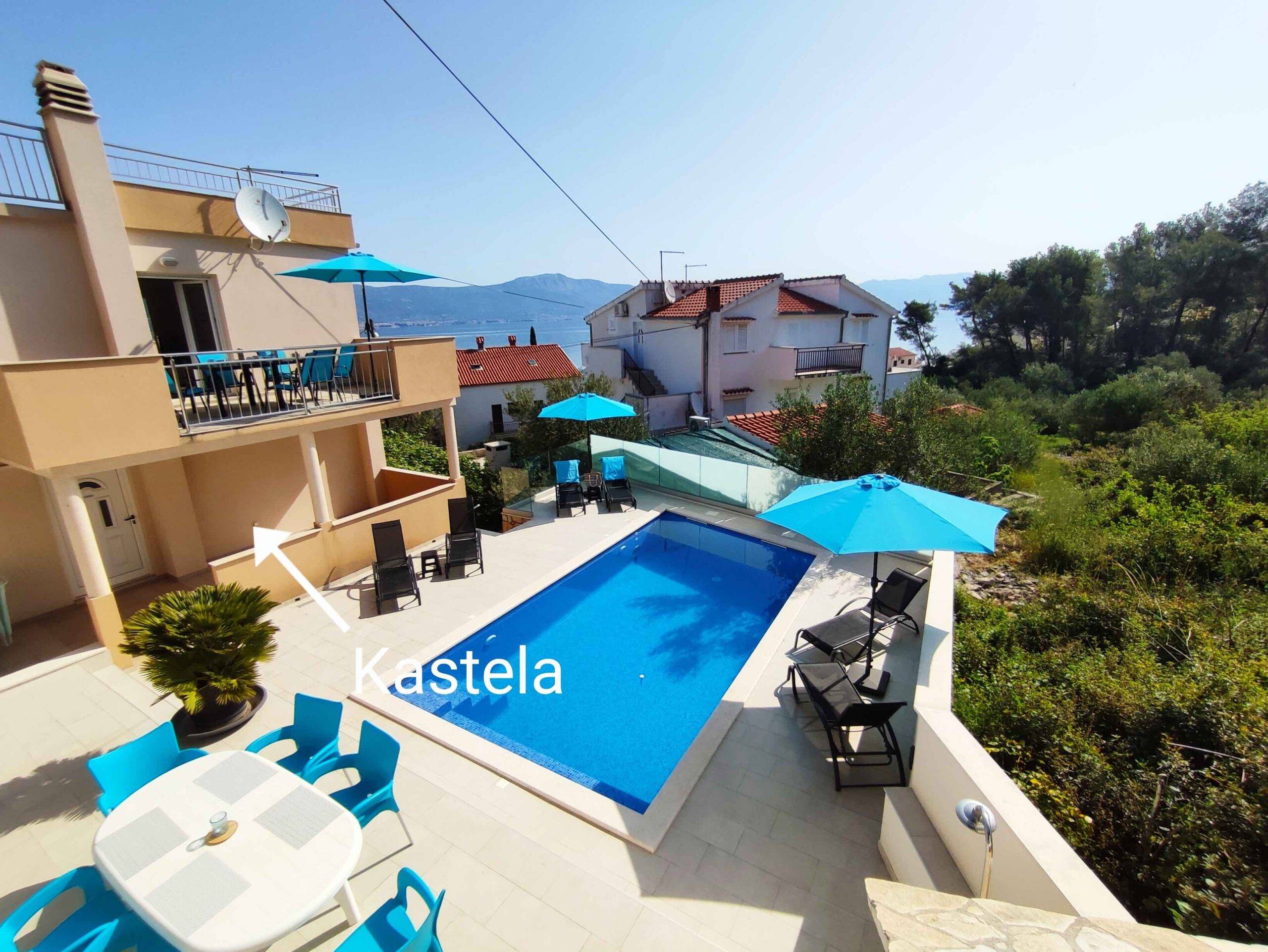 Das Apartment Kastela hat seinen Eingang auf der Südseite des Hauses Mirafour und liegt direkt am Pool. Beim Eingang befindet sich sofort die 17 qm überdachte Terrasse, die für 4 Personen zum verweilen einlädt. Hier kann man den Tag mit einem leckeren Frühstück beginnen und am Abend mit einem Glas Wein ausklingen lassen.