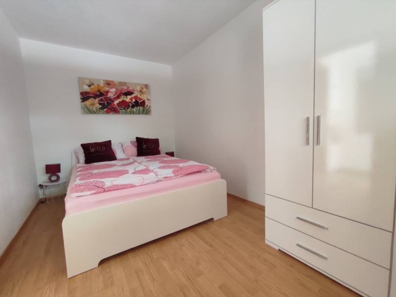 Das Apart­ment Sibenik liegt im Sou­ter­rain und besticht durch die 40 qm gro­ße Ter­ras­se, die süd­öst­lich aus­ge­rich­tet ist. Auf der Hol­ly­wood­schau­kel oder einem schat­ti­gen Plätz­chen unter dem Kiwi­dach kön­nen Sie erhol­sa­me Stun­den in pri­va­ter Atmo­sphä­re genie­ßen. Das Apart­ment sel­ber wur­de 2019 reno­viert und mit neu­en Möbeln ver­se­hen. Der Flur, das Bad und die Wohn­kü­che sind gefliest und im Schlaf­zim­mer wur­de Lami­nat verlegt.