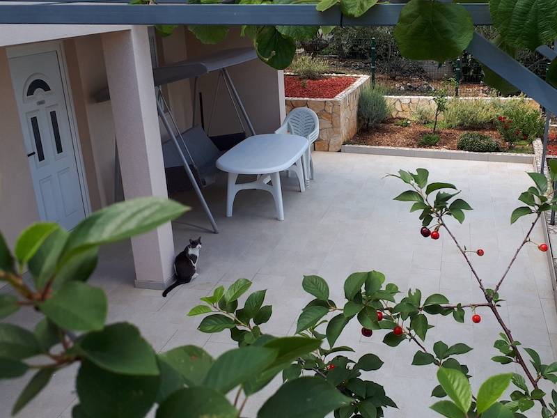 Das Apart­ment Sibenik liegt im Sou­ter­rain und besticht durch die 40 qm gro­ße Ter­ras­se, die süd­öst­lich aus­ge­rich­tet ist. Auf der Hol­ly­wood­schau­kel oder einem schat­ti­gen Plätz­chen unter dem Kiwi­dach kön­nen Sie erhol­sa­me Stun­den in pri­va­ter Atmo­sphä­re genie­ßen. Das Apart­ment sel­ber wur­de 2019 reno­viert und mit neu­en Möbeln ver­se­hen. Der Flur, das Bad und die Wohn­kü­che sind gefliest und im Schlaf­zim­mer wur­de Lami­nat verlegt.